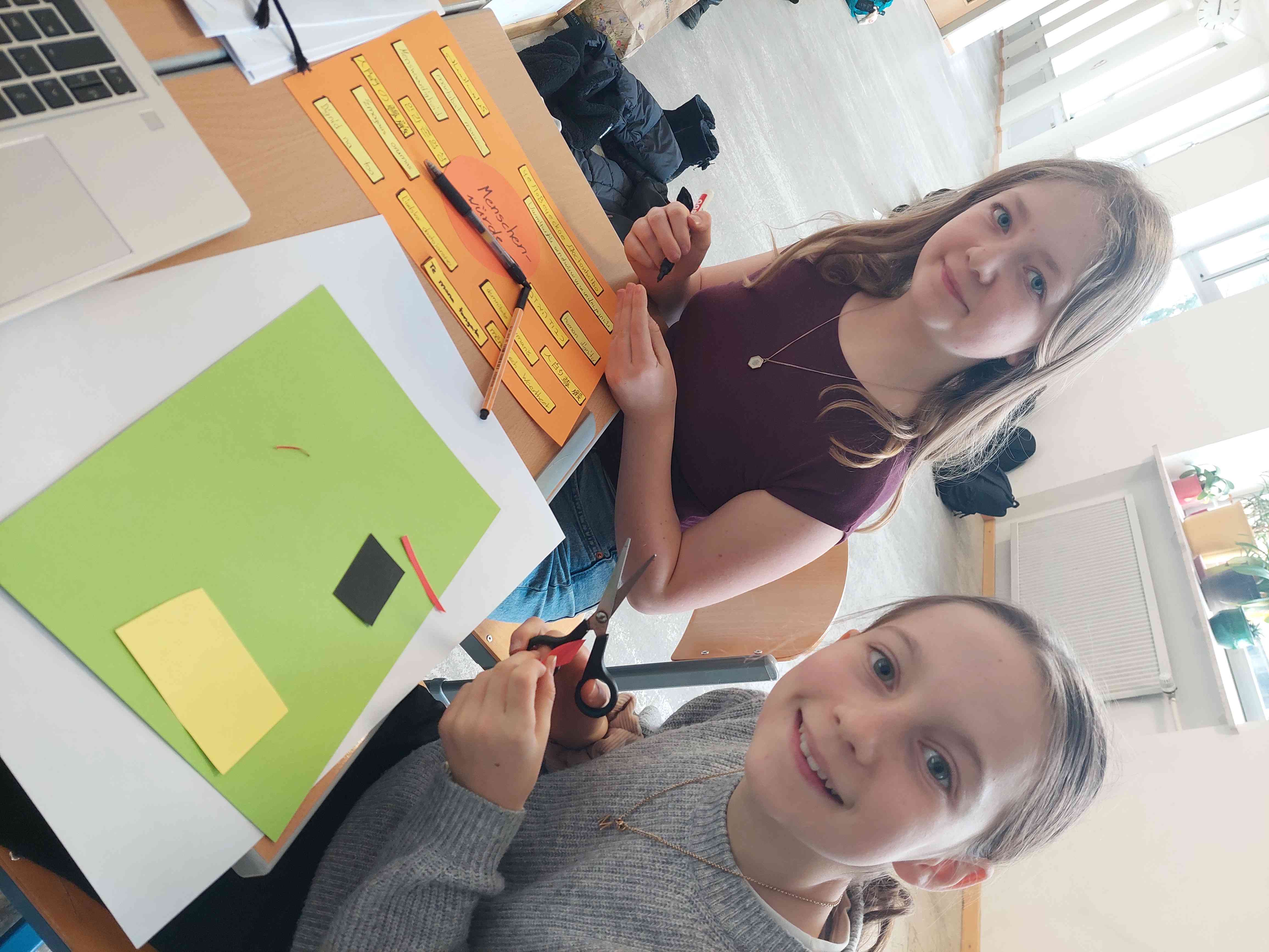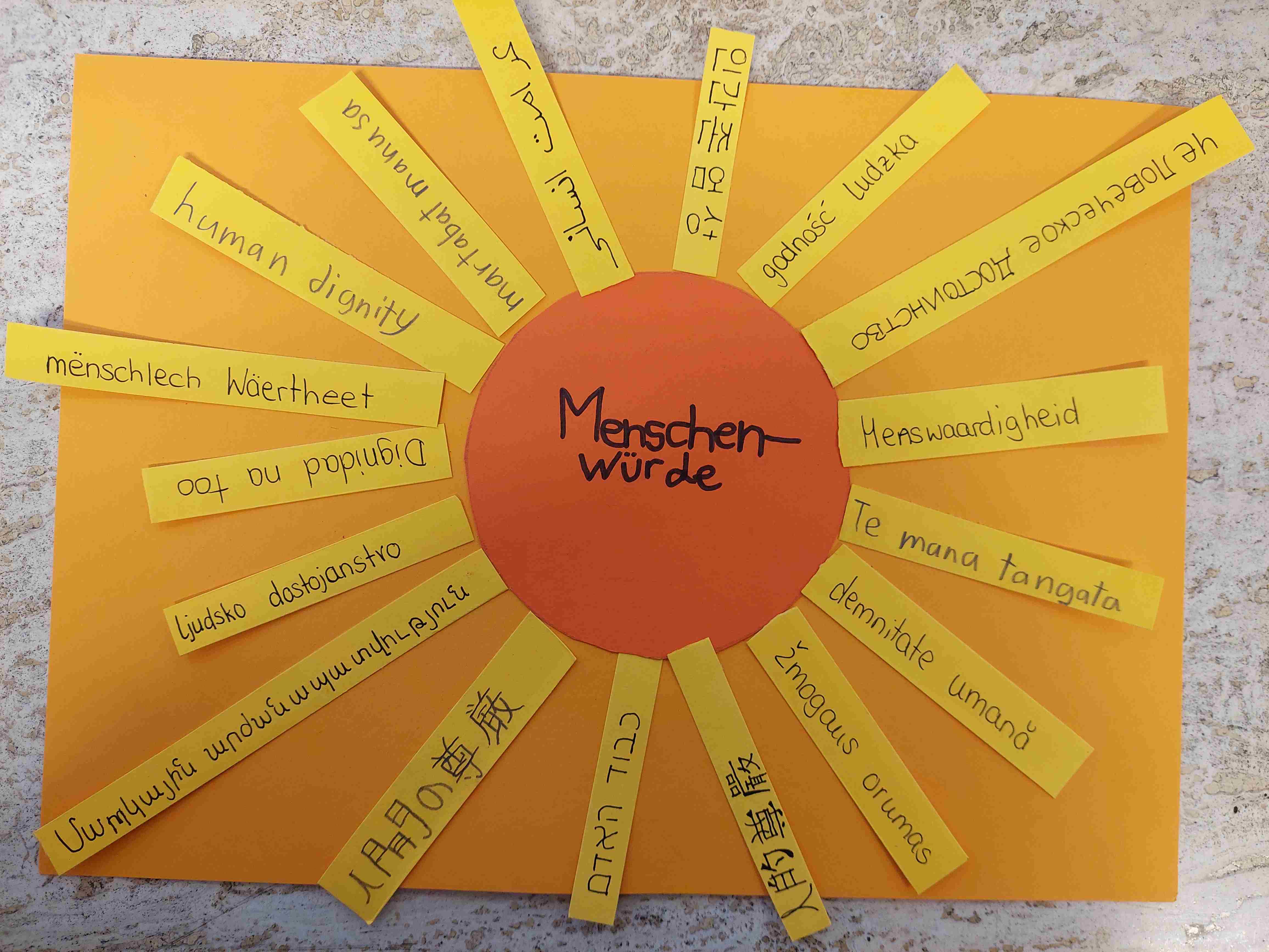 Eine weitere Gruppe beschäftigte sich mit den Menschenrechten. Jede Kleingruppe wählte ein Menschenrecht aus und gestaltete ein Plakat, auf dem dieses Recht in zahlreiche Sprachen übersetzt wurde. Besonders herausfordernd waren dabei kyrillische, chinesische oder arabische Buchstaben.
