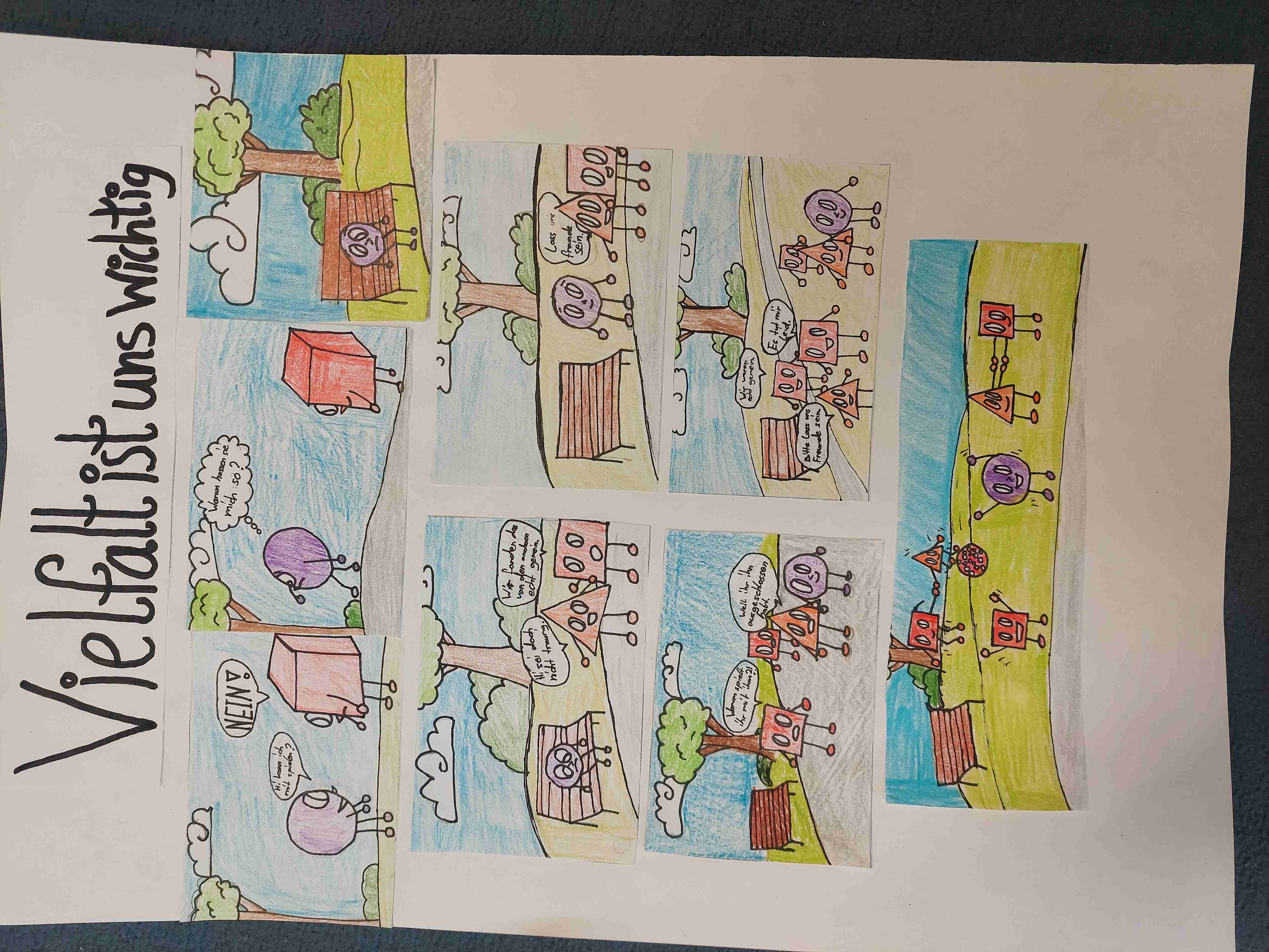 In der Comic-Gruppe entstanden eindrucksvolle Comics rund um das Thema Vielfalt. Die Schülerinnen und Schüler schlüpften dabei in verschiedene Rollen: Einige zeichneten, andere entwickelten Texte oder entwickelten die Ideen für die Storyline.