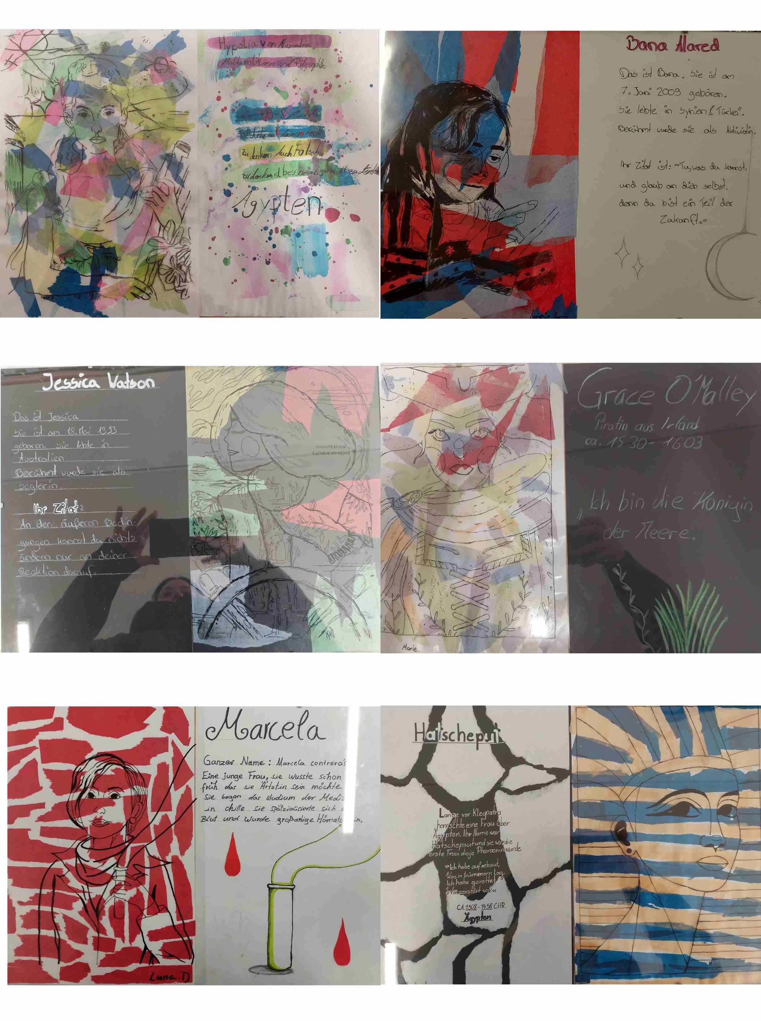 In diesem Angebot wurden Portraits bedeutender Frauen gestaltet. Die Vorlagen stammten aus der Buchreihe Good Night Stories for Rebel Girls. Mit farbenfrohen Collage-Hintergründen und einem Steckbrief vervollständigten sie ihre Kunstwerke.