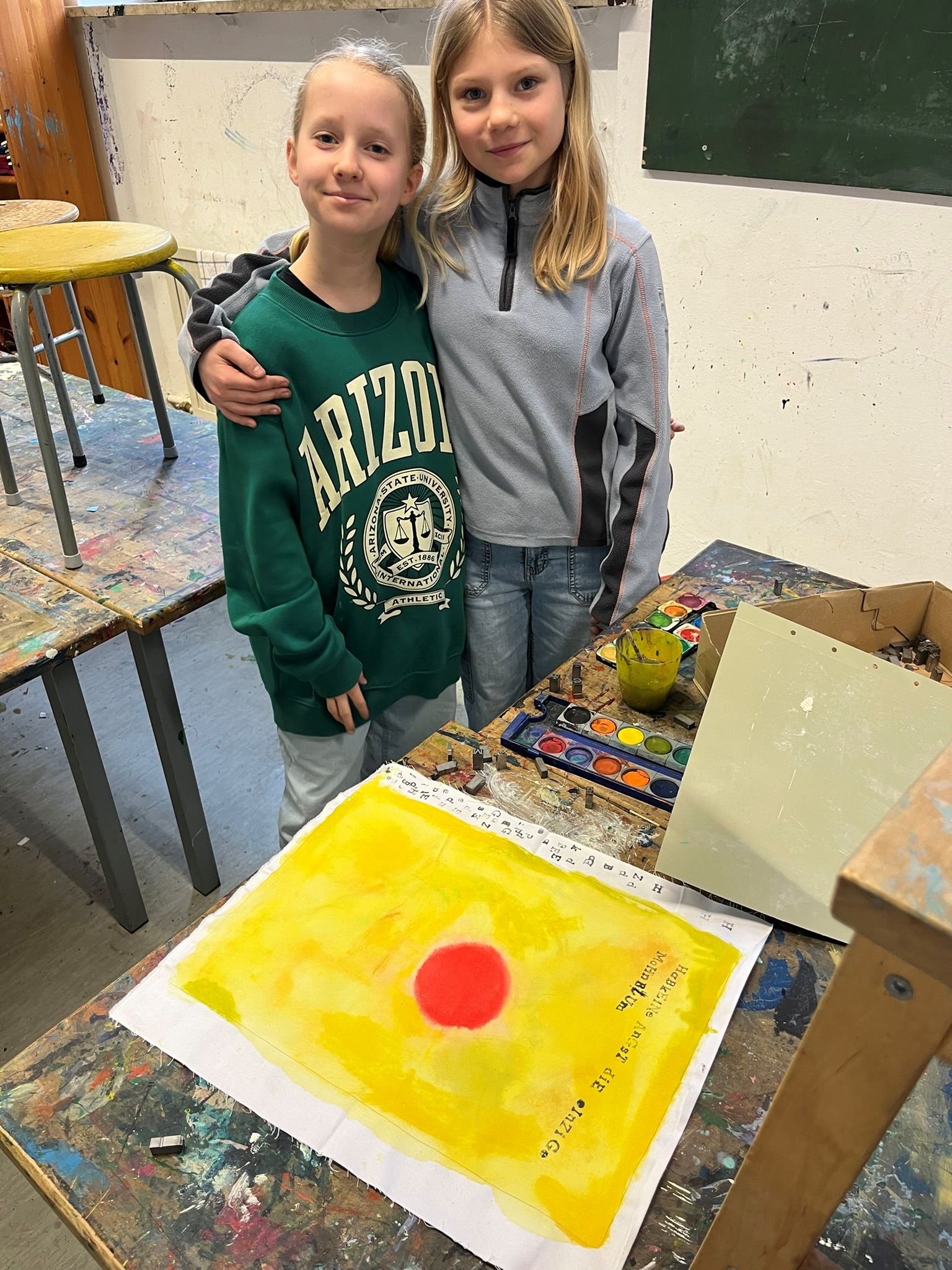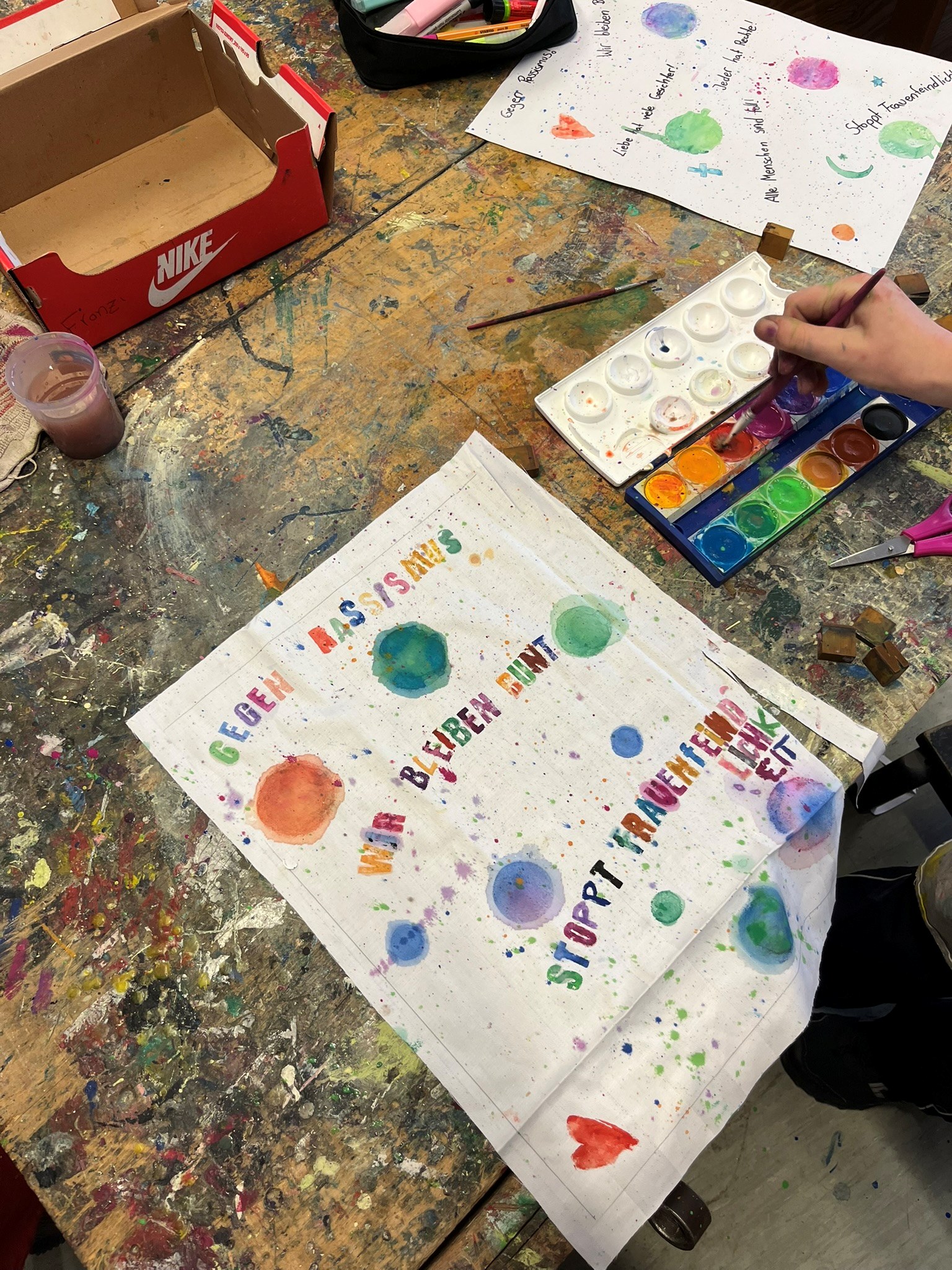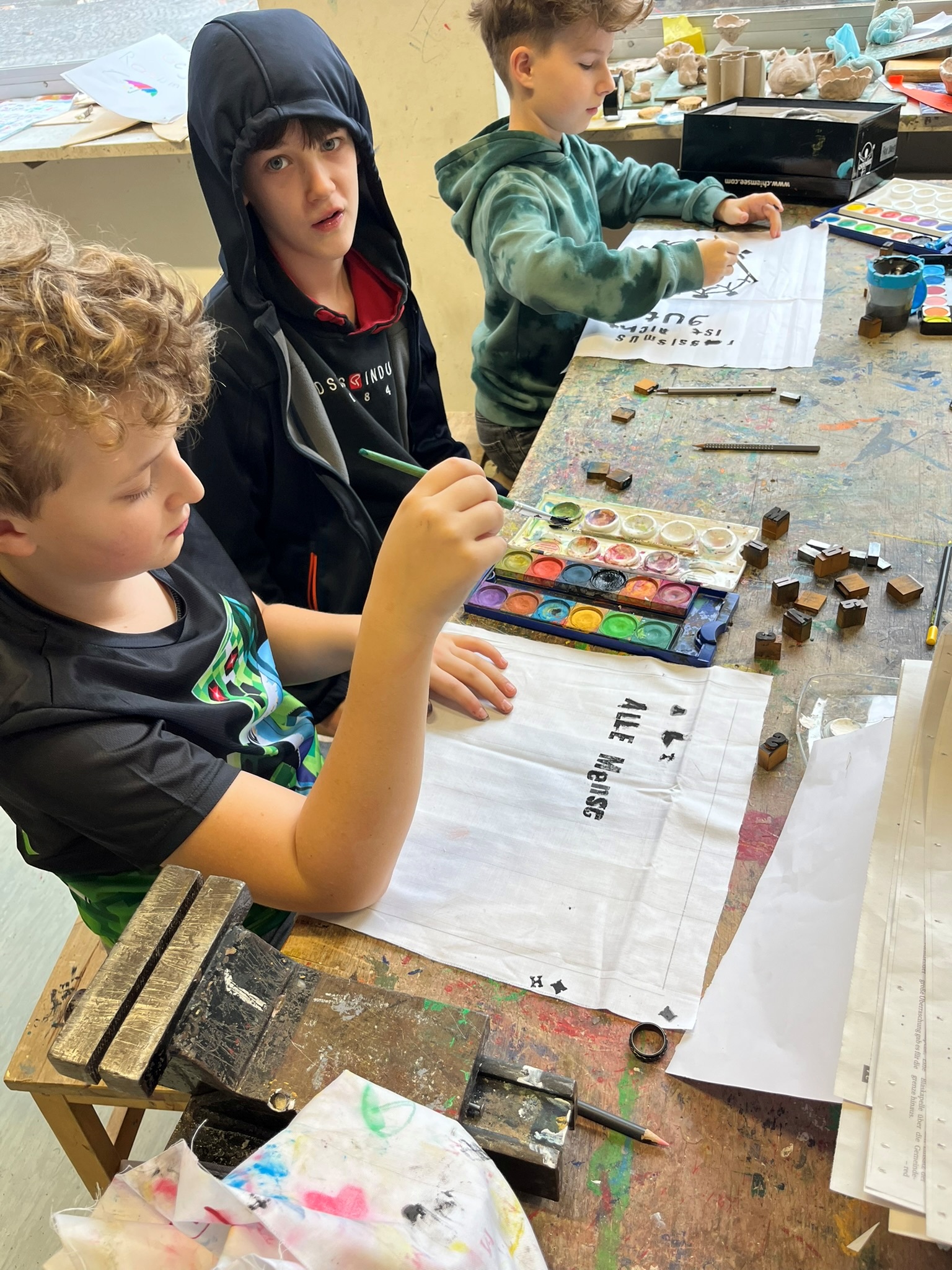 In diesem Angebot druckten die Schülerinnen und Schüler Sprüche für Vielfalt auf Stoffstücke. Am Ende wurden alle Stoffrechtecke zusammengenäht – das entstandene Banner wird künftig den Mittelstufenflur schmücken.