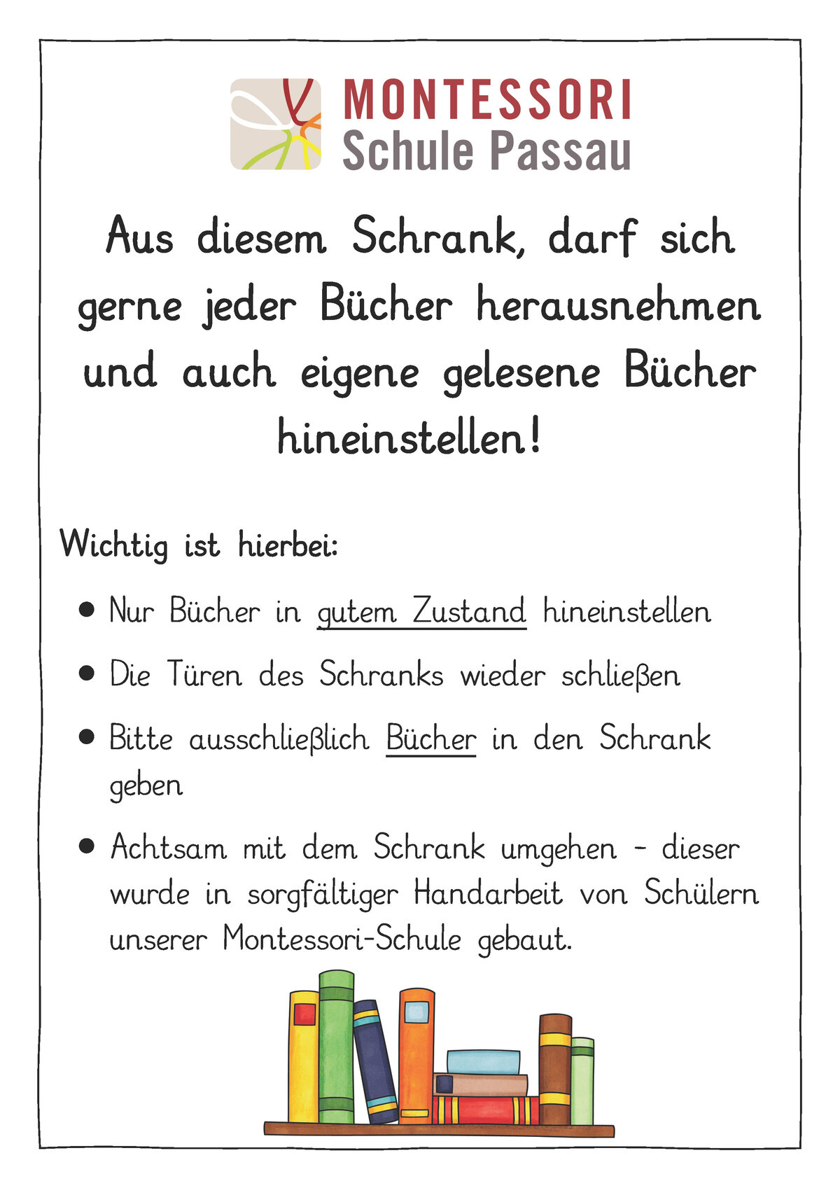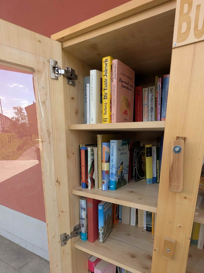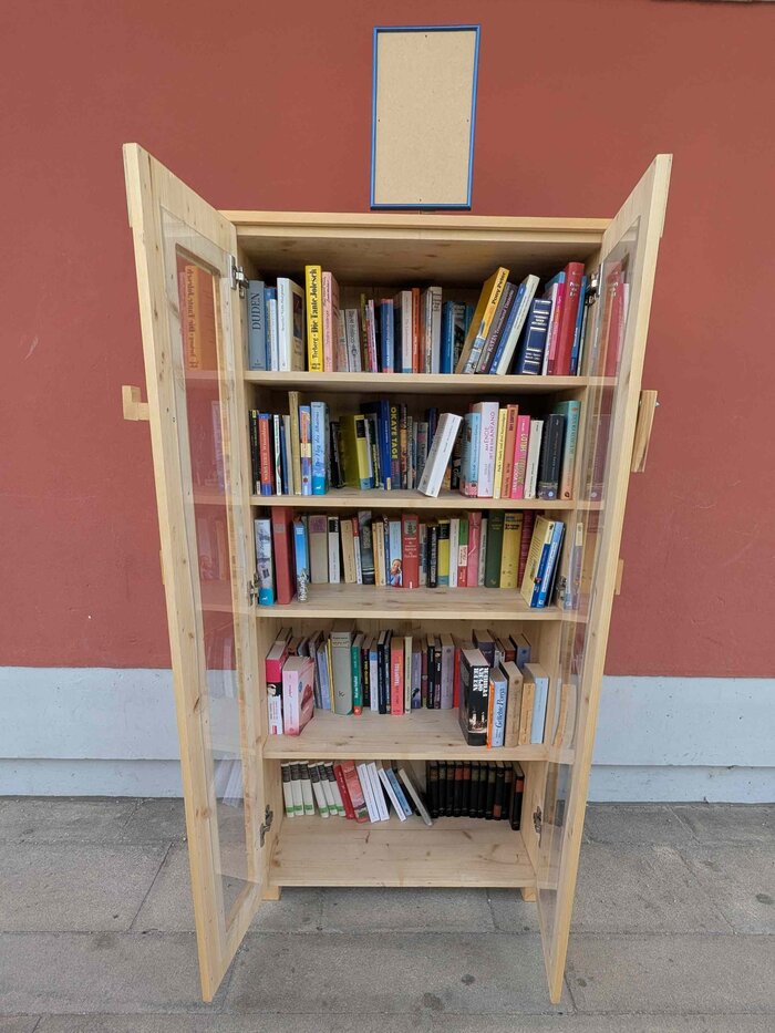 In den offenen Bücherschrank könnt ihr Bücher, die ihr schon gelesen habt und nicht mehr braucht, reinstellen und so einer Person eine Freude bereiten. Denn ihr könnt euch die Bücher, die schon im Bücherschrank sind, herausnehmen und mit nach Hause nehmen. Wir würden uns freuen, wenn ihr euch die Zeit nehmen würdet, eure gelesenen Bücher auszusortieren und in den Schrank zu stellen. Gerne könnt ihr die Bücher, die ihr euch genommen und gelesen habt, danach wieder zurück stellen, damit so auch andere Leute die Chance erhalten diese zu lesen. Vielen Dank!