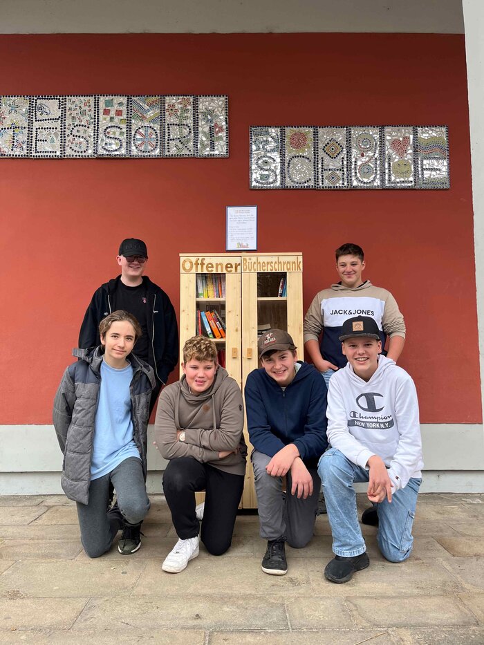 Vor unserer Schule steht seit Dezember ein offener Bücherschrank, den wir, Schüler aus der Oberstufe, im Rahmen von Projekt Zukunft gebaut haben. Das Holz haben wir von der Schreinerei Waldbauer in Büchlberg gesponsert bekommen und geschützt werden die Bücher von einer Plexiglasscheibe, welche vom Bauhaus gespendet wurde. Die erste Bücher-Ausstattung haben wir von der Europabücherei geschenkt bekommen.