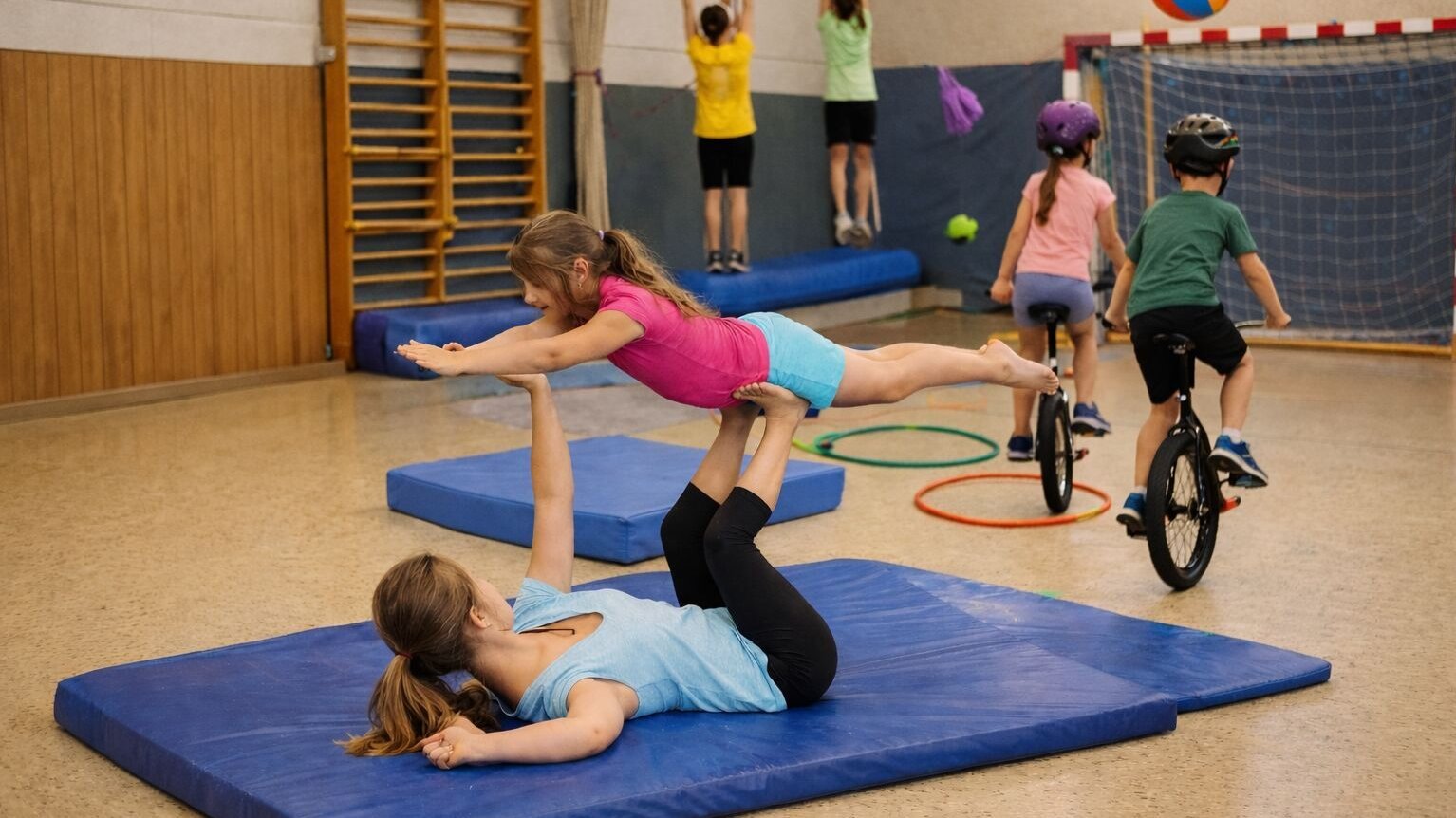 Erlebe Bewegung einmal anders! Akrobatik, Jonglieren, Vertikaltuchturnen oder Einradfahren. Du hast die Möglichkeit deinen Körper mal anders wahrzunehmen und was Neues auszuprobieren!